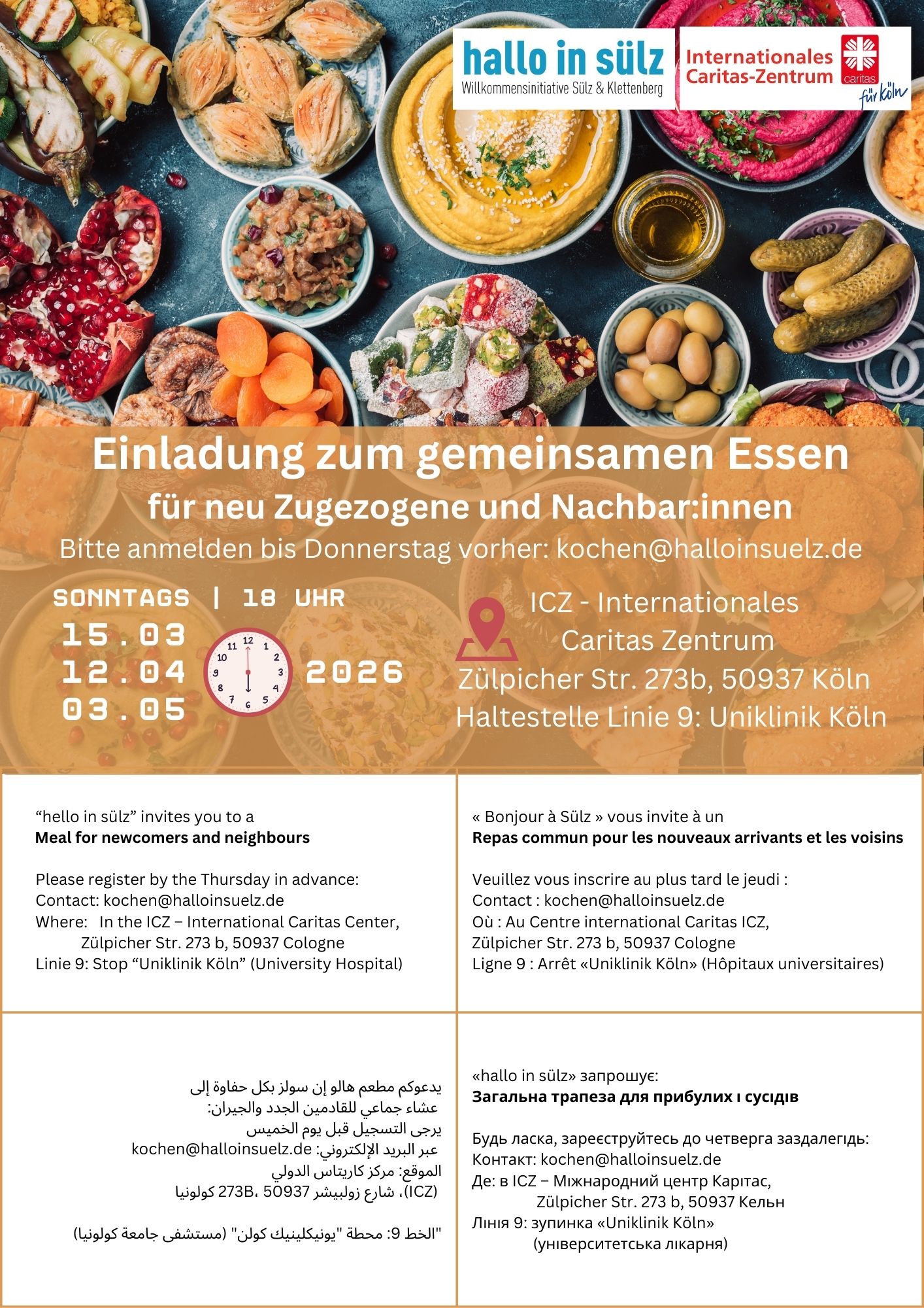 im ICZ (Internationales CaritasZentrum), Zülpicher Str. 273b, 50937 Köln wieder Hallo-in-Sülz-Treff statt, unser Café für die Begegnung von Menschen aus dem Veedel und aus der Unterkunft für geflüchtete Frauen und Kinder. Dort ist eine lockere Atmosphäre. Die Erwachsenen plaudern und tauschen sich aus – und die Kinder haben Raum zum Spielen. Hier lernen wir uns gegenseitig kennen – unverbindlich, aber mit allen Optionen auf ein nettes Miteinander.